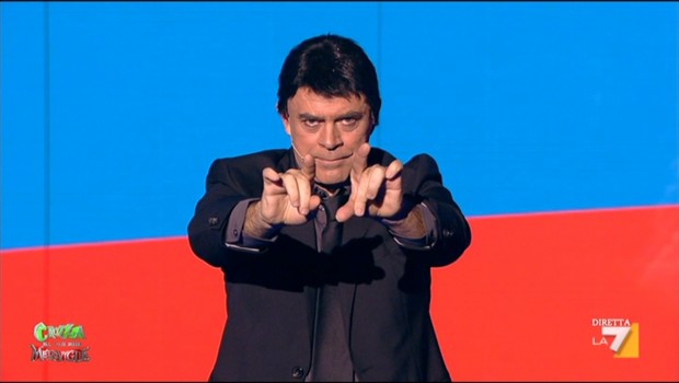 Ampio spazio per il candidato dei grillini, Marcello Della Negra, aspirante cantante ad Italia’s Got Talent e adesso il più votato sul web: dopo l’esibizione del cantante, ha commentato Crozza tra l’ironia generale, Freddie Mercury è morto di nuovo. Scalpore, invece, per il candidato della Lega, Scopellitti: condannato a sei anni di carcere per falso in bilancio. Quasi meglio chi cantava, scherza Crozza.