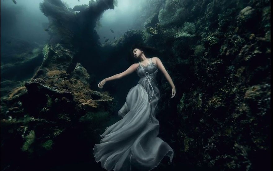 Così, Ben Von Wong si è immerso nel blu raggiungendo un vecchio relitto sulle coste vicino a Bali, in Indonesia, seguito da un piccolo gruppo di bellissime modelle.